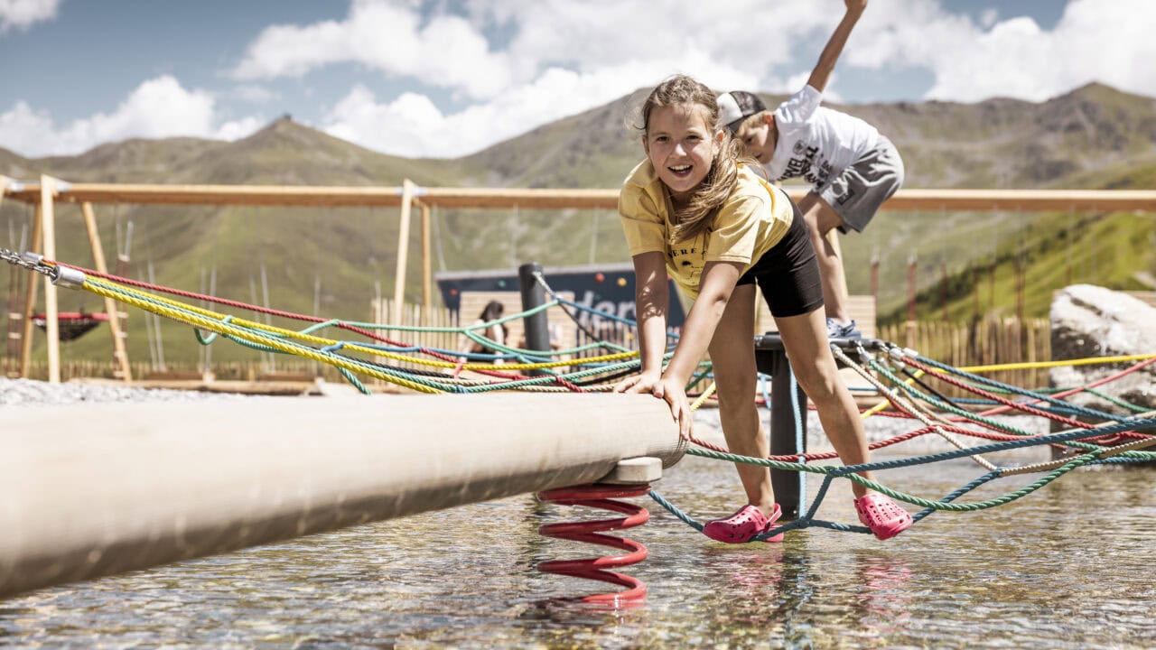 Abenteuer für alle: Die pure Lebensfreude wartet draußen – direkt vor der Tür. Erlebe Familienglück im Goldpark Nauders mit Wasserspielplatz, Carts und Klettersteig.