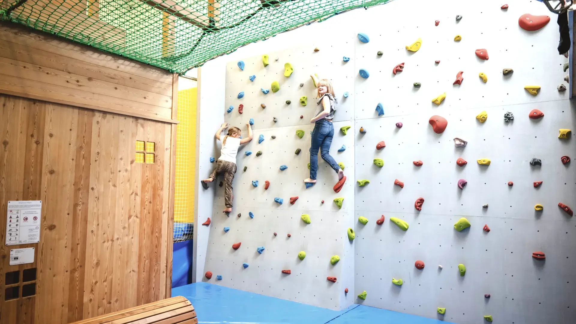Our Alpine-Sports-Halle is the ultimate action highlight for our guests, catering to ages 5 to 95. There is simply no chance of boredom here, as the hall is packed with high-energy fun and games: look forward to the challenging Alpine bouldering wall, an exciting rope course, and a huge Olympic trampoline. We have paid particular attention to your safety; the entire hall has been meticulously equipped in collaboration with TÜV experts and adheres to the latest safety standards. Come in and have fun.
